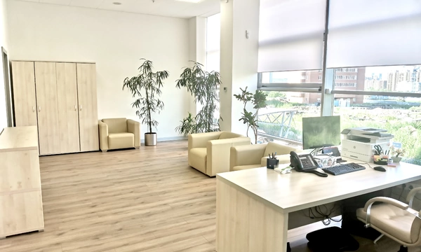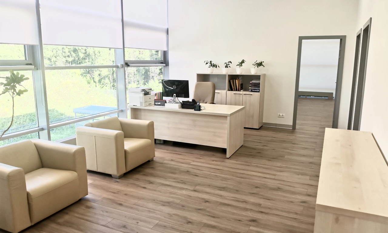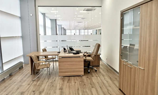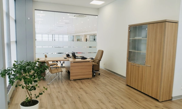 Перед нами стояла задача подобрать "простую, строгую, светлую" мебель, в достаточно ограниченном бюджете. После переговоров выбор пал на коллекцию мебели Вектор, лаконичный строгий дизайн, массивная столешница 48мм и очень приятный ценник стали решающими факторами. Следом нами был разработан дизайн-проект с учетом пожеланий заказчика. В результате мы получили зону работы секретаря в едином стиле с местами для хранения документов и диванчиками для ожидающих, из которой посетитель кабинета попадает в большую переговорную, совмещенную с кабинетом руководителя. Всё, как хотел заказчик.
