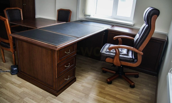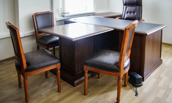 После обсуждения нюансов заказа с менеджером Prime Wood выбор остановили на мебели итальянского производства из коллекции "Conte". Массивный письменный стол со вставкой из натуральной кожи на столешнице выполнен из шпонированной МДФ и массива дерева. Брифинг-приставка, креденция и вместительный шкаф из двух секций - со стеклом и с глухими дверьми - дополняют композицию. Шесть деревянных стульев "Версаль" в классическом стиле в натуральной коже с использованием эффектных декоративных обивочных гвоздей придают интерьеру завершённый вид. Кабинет выглядит респектабельно, роскошь натуральной древесины подчёркивают его значительность.
